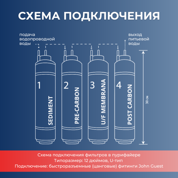 Характеристики: Картриджи имеют выходы для быстрого соединения типа цанга-цанга, U-тип Могут использоваться в любых моделях пурифайеров напольного типа.
